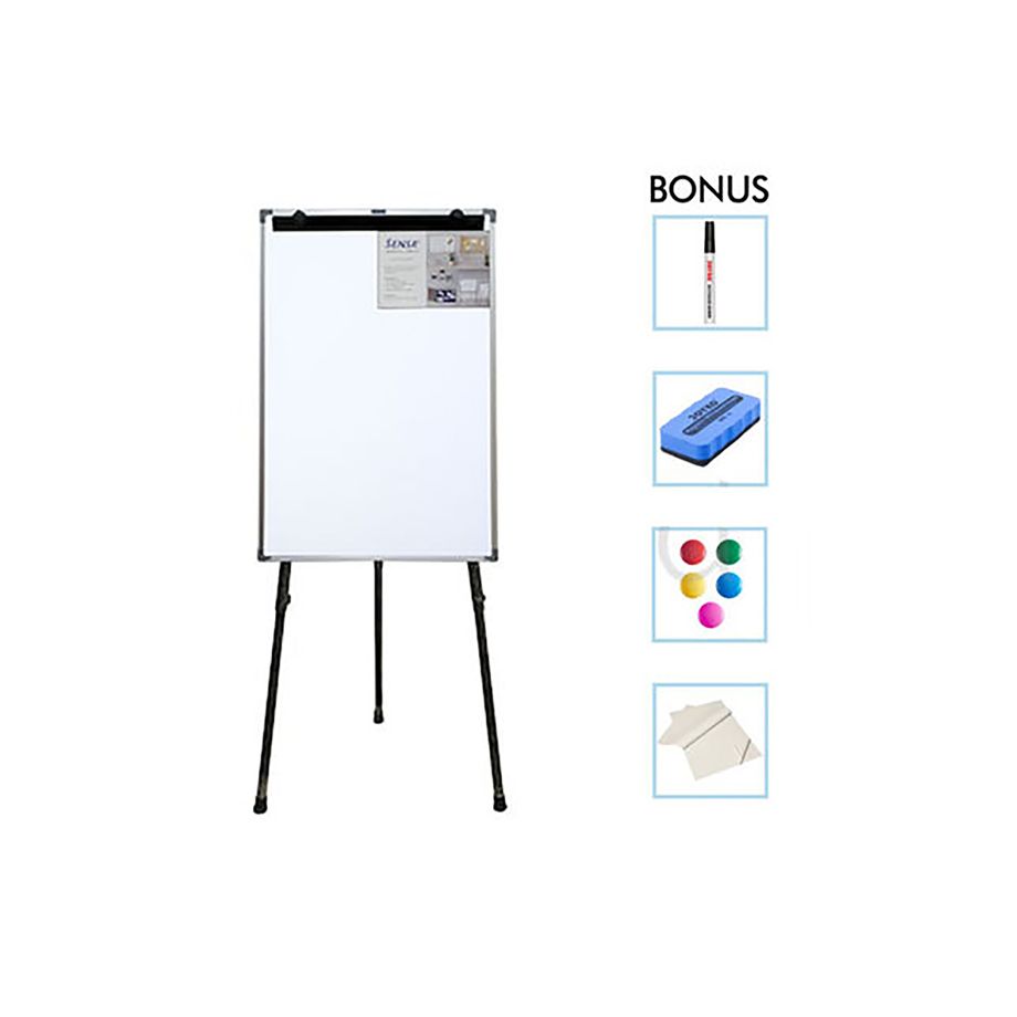 Magnetic standing whiteboard in 90x60 cm including magnets, marker, and whiteboard eraser.