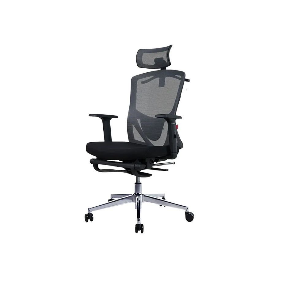 Adjustable seat and headrest height, spacious seat, mesh fabric, aluminum foot base.