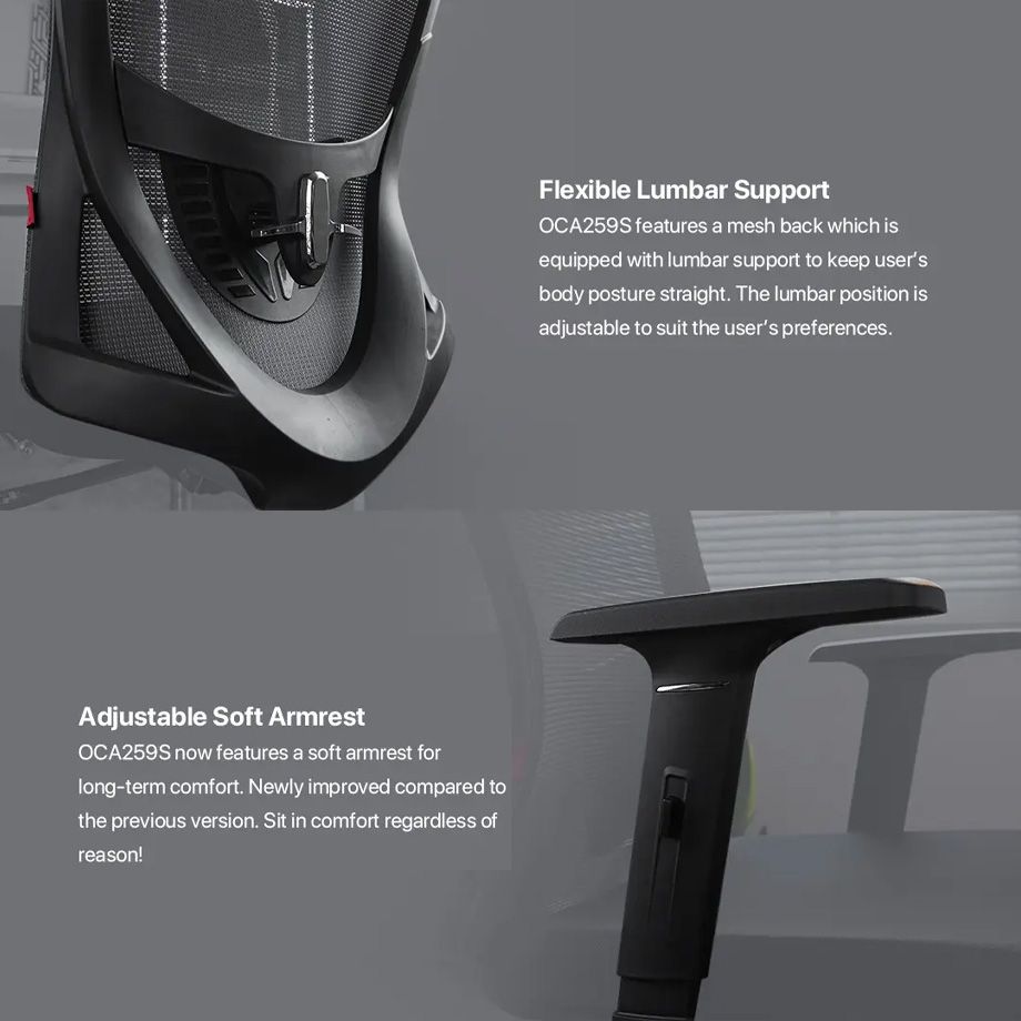 Discover the OCA259, the perfect ergonomic office chair for remote workers. With its sleek black design, it offers superior comfort through a breathable mesh backrest, adjustable settings, and tailored lumbar support. Ideal for enhancing productivity in any home office setup. Rent the OCA259S model for an unmatched work-from-home experience.
