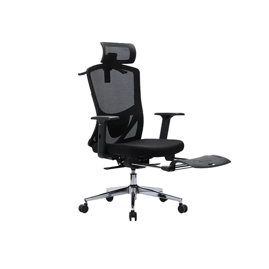 Adjustable seat and headrest height, spacious seat, mesh fabric, aluminum foot base.